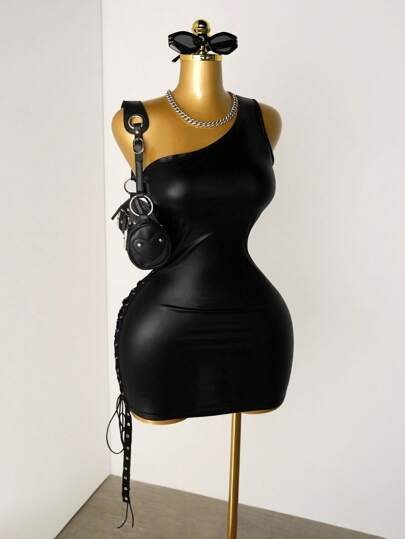 Mistrie Women's Sexy Nightclub Party PU Leather Side Lace-Up Bodycon Mini Dress - Black - View 1