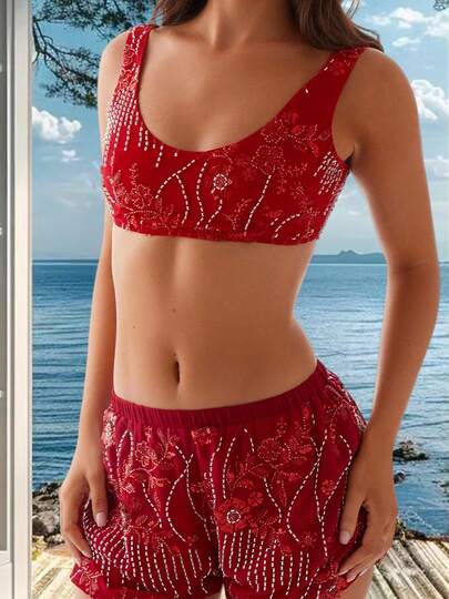 Women's Summer Sequin Bralette Slim Fit Stylish Scoop Neck Sleeveless Sparkly Crop Tops, S/M/L - Red - View 1