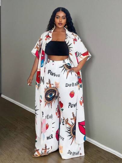 Slaydiva Plus Size Women Linen Printed Long Dress, Printed Linen Shirt, And Linen Pants Set - White - View 1