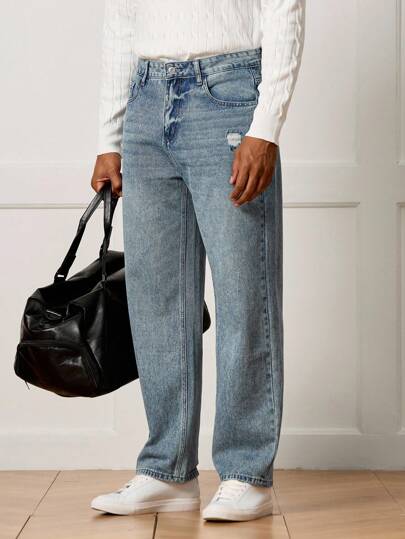Manfinity CityGents Men's Casual Pocket Ripped Skinny Straight Leg Jeans Men Loose Fit Jeans - Medium Wash - View 1