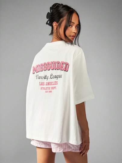 MISSGUIDED Varsity League Oversized T-Shirt College Casual Campus Style Print Back Drop Shoulder Casual Streetwear Summer Spring Daily Wear - White - View 1