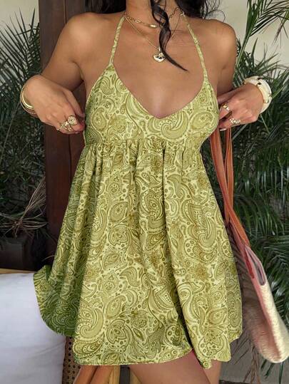 Sunnyshic Paisley Print Deep V-Neck Mini Dress - Dark Green - View 1