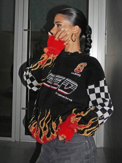 SHEIN ICON Fall Clothes Women Spring Bikercore Fire & Letter Pattern Drop Shoulder Sweater,Long Sleeve Tops,Knitted Sweater - Black - View 5