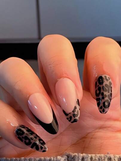 24 Pieces Of Nail Art Long Drop-Shaped Black French Leopard Nail Art Fake Nails And Nail File Are Suitable For Female Girls To Wear Nails Press On Nails. Nail Supplies Nails - Black - View 1