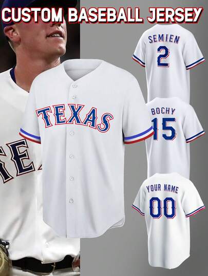 Customized Name And Number Boyfriend Style Men's Embroidery Baseball Jersey Texas WhiteV-Neck Personalized Short Sleeve Button Down Shirts Party Games Training Sports Tops S-Xxl - White - View 1