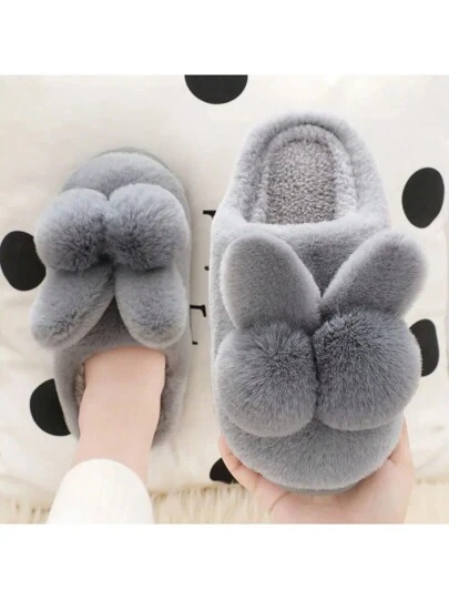 Women Fluffy Slide Slippers, Thick Sole Indoor Non-Slip Warm Plush Shoes, Cute Home Slippers For Men & Women, Pink - Grey - View 2