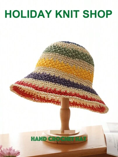 1pc Colorful Striped Woven Retro School Style Foldable Dome Sun Hat, Suitable For Daily, Casual, Travel - Multicolor - View 1