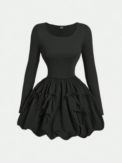 SHEIN MOD Square Neck, Long Sleeve Ruffle Hem Bow Black Dress,Bubble Skirt,Mini Skirt, Dress,Winter Women Clothes,Rave Festival Outfits,Date Night Dress - Black - View 1