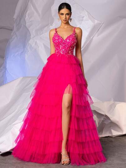Sparkly Sequin Lace Applique Tulle Prom Dresses With Multi Layer Hem V Neck Spaghetti Strap Homecoming Dresses For Teen Long Puffy Hem Mesh Evening Gown, Elegant Formal Dress, For Wedding Guest, Graduation, Dinner - Hot Pink - View 1