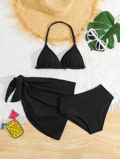3pcs/Set Tween Girl White Patterned Swimwear Set, Special Fabric Design, Fashion Casual Elegant Suitable For Swimming And Vacation In Summer Kids Swimming ,Kids Beachwear - Black - View 1