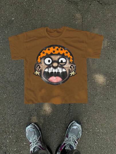 Manfinity EMRG Men's Casual Cartoon Character Printed Crew Neck Short Sleeve T-Shirt, Summer - Brown - View 1