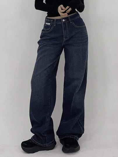 DAZY Women Front Button Closure Multi-Pocket Simple Baggy Jeans, Casual Daily Wear,Back To School Clothes - Medium Wash - View 1