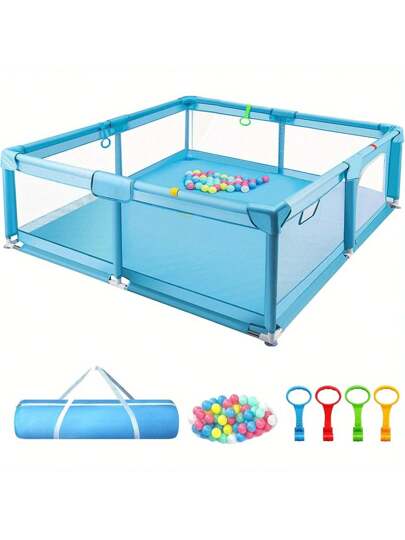 Baby Playpen For Babies And Toddlers With Mesh Walls, Ocean Balls & Pull Rings Included, For Indoor & Outdoor Use, Toddler Fence - Breathable Mesh, Extra Large Play Yard - Blue - View 1