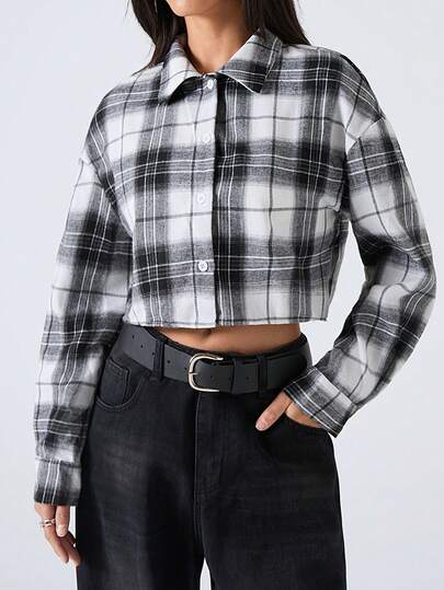 SHEIN EZwear Women's Spring & Fall Dropped Shoulder Long Sleeve Box-Shaped Cropped Plaid Shirt - Black and White - View 1