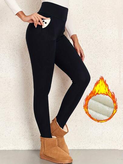 Pockets Fleece Lined Leggings Women - Thick Soft High Waisted Black Tummy Control Thermal Warm Pants For Cold Winter - Black - View 1