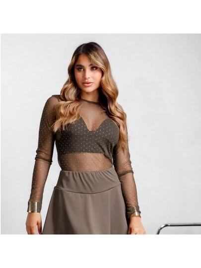 Women's Round Neck Long Sleeve Sheer Minimalist Casual Top, For Everyday Wear - Olive Green - View 1