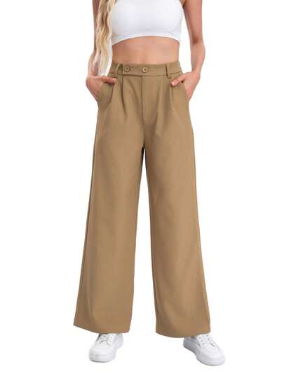 High Waisted Wide Leg Pleated Dress Pants - Khaki - View 1