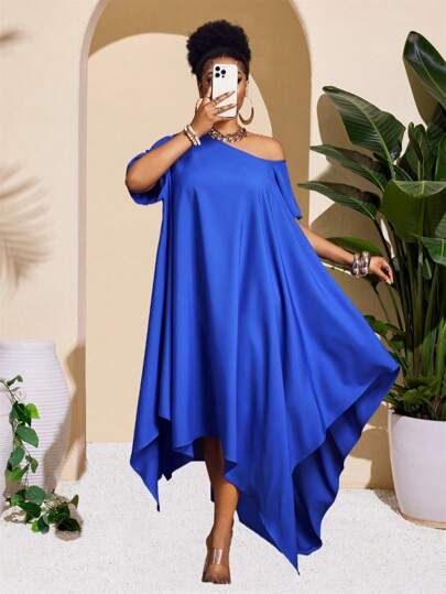 Slaydiva 2025 New Rave/Easter Outfit, Women Old Money Style, Country Concert Outfit, Going Out Outfit, Fairycore, Festival Outfit, Tropical Vacation, Women Summer Outfit, Summer Rave, European Summer, Spring Outfit, Western Wear For Plus Size Women, Concert, Graduation Outfit, Versatile Daily Casual Minimalist Sexy/Extremely Simple One-Shoulder Short Sleeve Loose Sleeveless Asymmetrical Hem Women Dress - ZZ - Blue - View 1