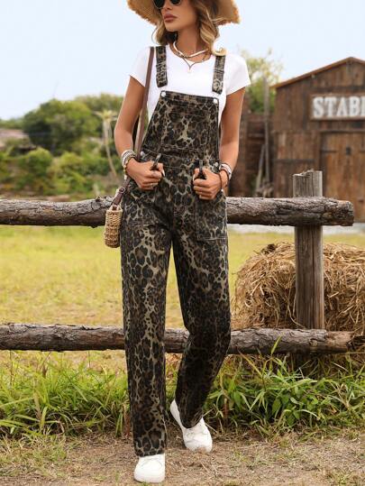 Breezaya Women's Loose Leopard Print Pocket Casual Dungarees - Multicolor - View 1