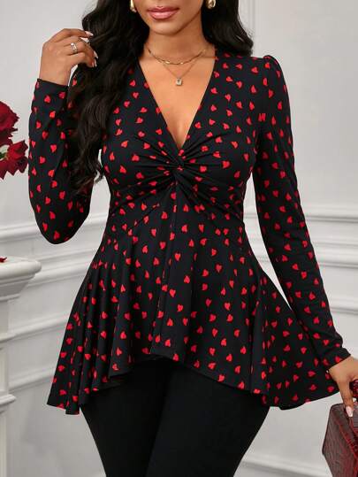 SHEIN Lady Valentine's Day/NEW YEAR Party /Versatile For Daily Wear At Work/Wear In All Seasons Women's Heart Graphic Twisted Front Long Sleeve Top - Multicolor - View 1