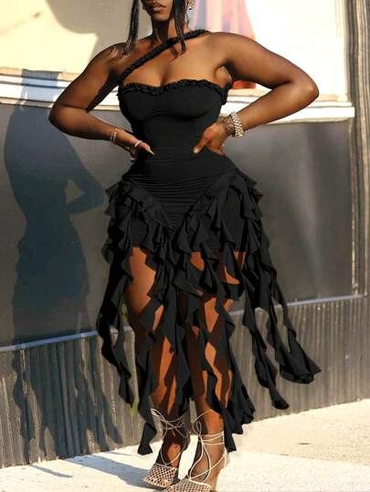 Plus Size Solid Color Crochet Backless Casual Dress, Perfect For Vacation - Black - View 9