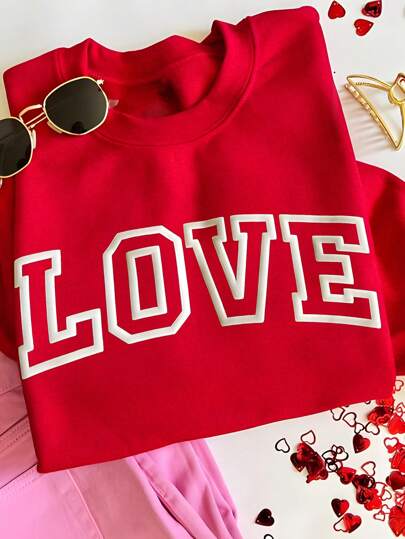 INAWLY Casual Round Neck Sweatshirt With Foaming Love Letter Print, Loose Fit, Spring/Autumn, Valentine's Day Gift Graduation,Back To School Outfits,Graduation,Teacher Outfits For Women,Back To School - Red - View 1