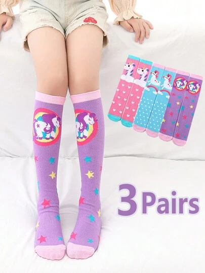 3 Pairs Girls Cute Colorful Straight Tube Knee High Socks, Suitable For Holidays, Everyday, All Seasons - Multicolor - View 1