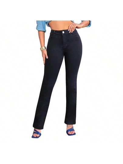 Women's Black Denim Straight Leg Pants With Embroidered Pockets And One-Button Waistband - Black - View 1