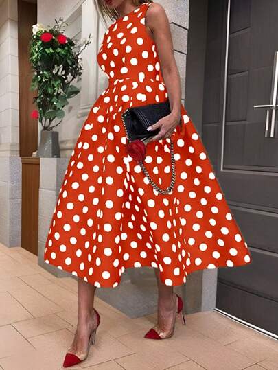 Chiquease 1 Pc Women Sleeveless Slim Waist Polka Dot A-Line Dress, Black Work Office Dress Maxi Women Outfit - Red - View 1