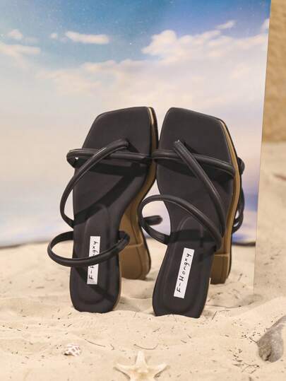 planare Women's Black Tie-Up Flat Sandals, Square Open Toe Flip Flops, Criss-Cross Strap Slip-On Sandals, Comfortable Beach Slippers - Black - View 1