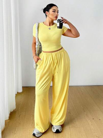 Flirla 2pcs/Set Casual Crew Neck Knitted Pullover T-Shirt And Wide-Leg Pants With Elastic Waist - Yellow - View 1