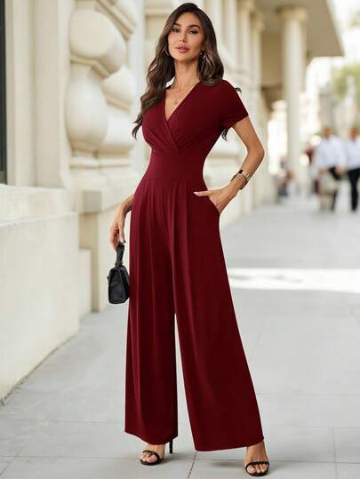 Editum Women's Elegant Solid Color Cinched Waist Jumpsuit For Commuting - Burgundy - View 1