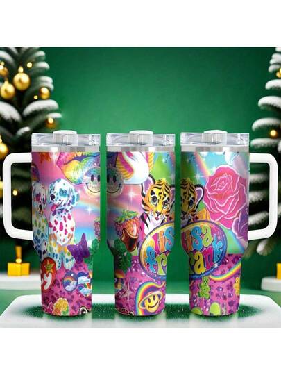1pc 40oz Rainbow Tiger Pattern Stainless Steel Tumbler With Handle Double-Wall Insulation Suitable For Hot And Cold Drinks, Perfect Gift For Friends, Great For Travel Back To School - Multicolor - View 1