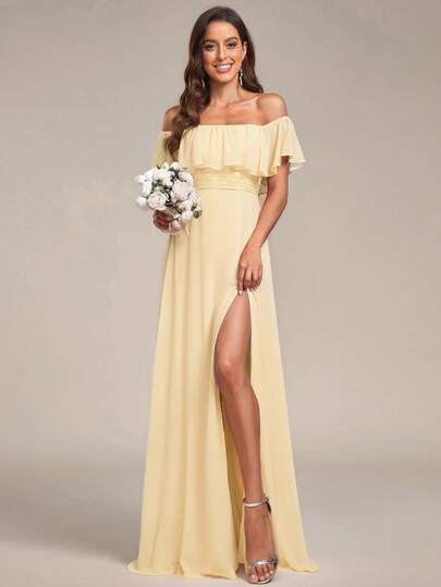 Off-Shoulder Ruffle Sleeve Side Slit A-Line Chiffon Cream Yellow Bridesmaid Dress, Wedding Guest Dress, Wedding/Graduation Ceremony - Yellow - View 1