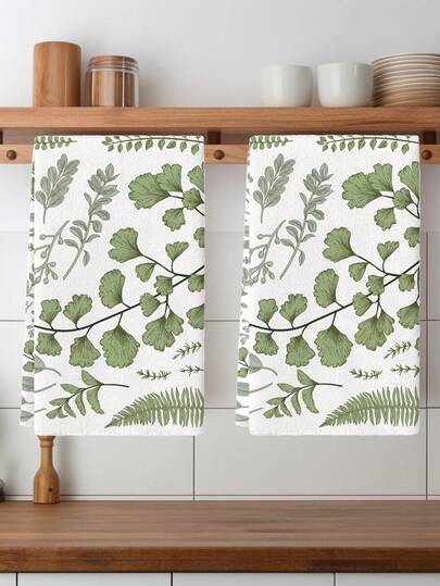 2 Pcs Kitchen Towels Set - Soft, Absorbent, Quick-Dry, Lint-Free, Reusable Dish Towels With Leaves And Herbs Pattern For Kitchen, Farmhouse, Holiday Home Decor - Sprout Green - View 1