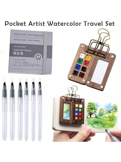 9pcs Mini Wooden Watercolor Kit, With 1 Grid 8/15 Grid Wooden Magnetic Palette Box, 6 Brushes, 1 Clip, 1 Portable Sketchbook - For Travel Watercolors,Back To School,School Supplies - Sets - View 9