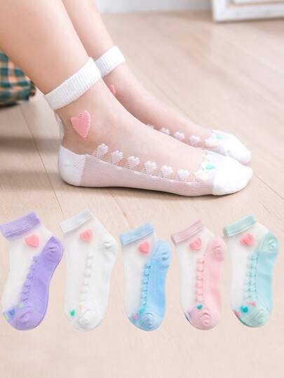 5 Pairs Simple Heart Pattern Lace Trim Kids Socks - Multicolor - View 6