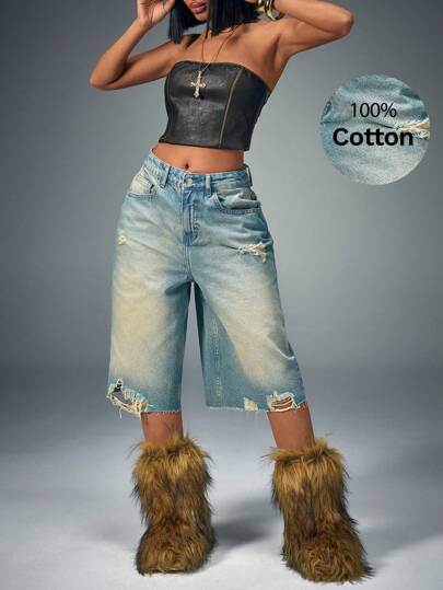 CasuGlow Women's Multi-Pocket Baggy Denim Shorts,Jorts, Casual Everyday - Blue - View 4