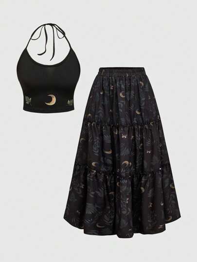 ROMWE Plus Size Gothic Moom & Plant Print Vintage 2 Pieces Set For Women - Camisole And Mini Skirt - Black - View 1