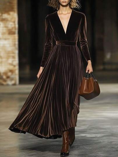 ii Women's Solid Color Deep V-Neck Pleated Hem Sexy Fashion Long Sleeve Dress - Brown - View 1