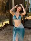 Bộ bikini 3 món màu xanh dương gợi cảm, thanh lịch, kiểu dáng tam giác, gồm váy sarong buộc eo kiểu ombre, thích hợp cho mùa xuân/hè, đi biển hoặc dự tiệc bể bơi.