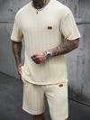 Manfinity CasualCool Men's Graphic Print Short Sleeve T-Shirt And Shorts Casual Set,Men Old Money,Daily Leisure, Weekend Trips, Outdoor Activities, Travel Expeditions, Relaxed Work Environments Or Semi-Formal Occasions, Boyfriend/Husband Gift, Anniversary /Birthday Gift Party Summer Vacation Holiday,Wedding,Spring To Summer,Easter,Men's Cream Knitted Short Sleeve T-Shirt And Shorts Set Casual Summer Outfit Textured Lounge Wear,Knit Two Piece Set Men,Men Two Piece Set Summer,Cream Outfit Men,Men Summer Sweatsuit