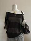 Attitoon Black & Gray Striped Casual Loose Oversized Drop Shoulder Drop Shoulder Short Sleeve T-Shirt For Women, Suitable For Going Out, Style Core Aesthetics, Aesthetic Style, Gothic Cybersigilism, Cybersigilism, Halloween, Y2K, Streetwear, Vintage, Grunge, Punk, Homecoming,Fall Tops Striped Off Shoulder Top Black And Grey Striped Top Off Shoulder Top Women Summer Top Off The Shoulder Tee