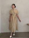 Andrea Bello Textured Beaded Ornament Stand Collar Form-Fitting Cinched Waist Short Sleeve Midi Dress, Romantic Spring/Summer Elegant FashionableOld Money Style For Spring Fall