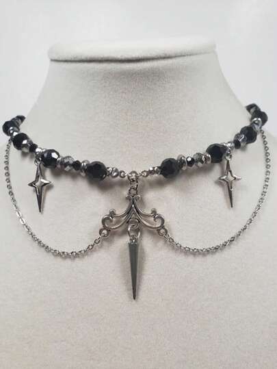 rundraw 1pc Hollow Star Rivet Crystal Beaded Geometric Pendant Fringe Punk Necklace, Multi-Color Stainless Steel, Suitable For Lady's Dance, Music Festival, Party And Daily Wear Accessories - Multicolor - View 1