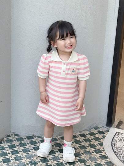 Little Girls' Sweet & Cute Puff Sleeve Turn-down Collar Short Sleeve Dress, Casual Soft & Comfortable For Summer - Pink - View 1