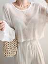 1pc Solid Color Knit Lace Patchwork Sheer Ruffle Hem Women's Black Long Sleeve Blouse, Elegant Lace Trim Fashion Ladies Vacation, Sheer Sleeve Fitted Crop Top, Suitable For Beach, Night Out, Vacation, School, Daily Wear, Spring, Summer, Autumn