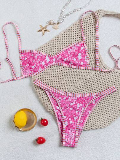 wohenmeili Women's Sexy Floral Print Backless Bikini Set, Beach Vacation Style - Hot Pink - View 1