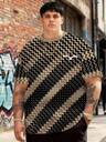 Plus Size Men 3D Graphic Print Plaid & Striped T-Shirt Set, Casual Sports Outfit, Elastic Breathable Polyester, Loose Fit, Suitable For Daily Wear & Gatherings